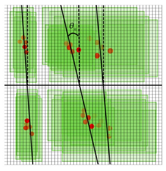 With the advancements in high-speed computing technology, employing deep learning for navigation line extraction has gained traction. A U-Net deep learning model has been used to detect crops without interruption in the field, given favorable weather conditions, suitable lighting, few weeds, and neatly arranged crops. Finally, the Hough transform operation was used to identify the guidance lines []. The crop row extraction method based on Tiny-YOLOv4 can quickly detect multiple objects in an image and extract crop feature points within the frame through binarization operations and mean filtering operations. Finally, regression analysis with the least squares method was used to fit a guidance line []. An object detection method combining YOLO-R and density-based spatial clustering of applications with noise (DBSCAN) can quickly identify the number of crop rows and the crops in each row. Crop row lines can be found through the least squares method, and under different rice growth stages, the crop row recognition rate reaches at least 89.87% [].