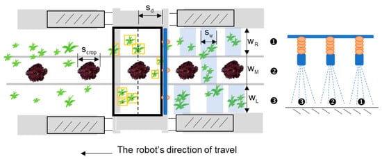 - During spraying test operation, setting the delay time of the sprayer according to the speed of the robot can avoid ineffective spraying. In this study, when the robot speed was 12.5 cm/s, with a sprayer time of about 0.5 s and a delay time of 2.5 s, the EWC and IWC reached 83% and 8% respectively, and the pesticide reduction reached 53%. Similar results were also presented in [], with a 34.5% reduction in pesticide usage compared with traditional uniform spraying methods. As the speed of the robot increased, the EWC decreased, and the IWC increased. At a speed of 35 cm/s, the average precision was too low, which indirectly resulted in a reduction in the number of pesticide applications. On the other hand, the unhealthy crops were about 7–12 cm in diameter. Even with the appropriate delay time set, there were still some unhealthy crops or weeds that could not be sprayed correctly.