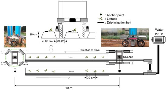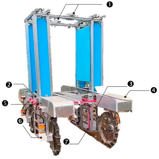 In the rapid development of smart technologies, their integration into agriculture has been critical to combating labor scarcity and an aging workforce. Contemporary practices in crop management, including plant monitoring, watering, pesticide spraying, and fertilizing, are still often performed manually using machines and tools. This requires farmers to focus on field operations for a long time, which results in long working hours and high labor costs. The proven efficacy of automation in performing monotonous tasks has seen its adoption across various sectors, with its applicability in agriculture being equally comprehensive, encompassing activities like weeding and harvesting []. Traditional small-scale agricultural robots were designed to navigate based on sensor fusion methods, which are suitable for structured environments []. Relying on the improvement of precision agriculture technology, the real-time kinemetric (RTK) global navigation satellite system (GNSS) (RTK-GNSS) and machine vision have played an important role in automatic guidance technology. RTK-GNSS has been pivotal in providing precise metrics for positioning, velocity, and timing, which assists users in planning the robot’s movement path [,]. In particular, after the user can define multiple specific positions to form a path in a known field environment, the robot can then autonomously move to that point to perform field operations and reduce errors through heading control [,].