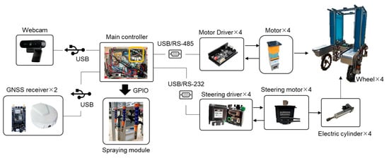 The experimental platform, shown in Figure 9, features a chassis composed of multiple modular mechanical components []. The height of the robot is available in two types: 80 cm and 200 cm. Its width is adjustable through a platinum connecting element. The shock absorber, forming a double A-arm shock absorber module, is 21 cm long with a 4 cm compression stroke. The wheels, made of hard rubber, have a diameter of 65 cm and a width of 8 cm. Each wheel is powered by a DC brushless motor (model: 9B200P-DM, TROY Enterprise Co., Ltd., Wugu, New Taipei City, Taiwan) coupled to a reduction gear set (model: 9VD360H, TROY Enterprise Co., Ltd., Wugu, New Taipei City, Taiwan) with a 360:1 reduction ratio and controlled by a motor drive (model: AGV-BLD-1S-200W, TROY Enterprise Co., Ltd., Wugu, New Taipei City, Taiwan). Additionally, four steering drives (model: CSBL1400, CSIM Inc., Xinzhuang, New Taipei City, Taiwan) are connected to four servo motors (model: CS60-150C8AE, CSIM Inc., Xinzhuang, New Taipei City, Taiwan) built into linear electric actuators (model: LOE-40-100-C-L5, LIND Inc., Taiping, Taichung County, Taiwan). The robot’s embedded board and peripheral electronic components are housed inside a control box. Two sets of RTK-GNSS modules (model: C099-F9P, u-Blox Inc., Thalwil, canton of Zürich, Switzerland) with two antennas (model: VEXXIS Antennas GNSS-502, NovAtel Inc., Issy-les-Moulineaux, France) are installed on the front and rear brackets at the top of the robot. An embedded board (model: Jetson Xavier NX, NVIDIA Inc., Sunnyvale, CA, USA), serving as the main controller of the robot’s operating system, executes deep learning algorithms for selective spraying and enables autonomous operation based on programmed instructions. A camera (model: BRIO 4K Ultra HD, Logitech Inc., Lausanne, Switzerland) is mounted under the central frame to capture images of field ridges, crops, weeds, or drip irrigation belts. The spray module, housed in a waterproof box attached to the side bracket, is connected by hoses to nozzles at the rear of the central bracket. The nozzles, directed toward the ground, cover the left, center, and right areas of the camera’s field of view. Data transfer connectivity utilizes Universal Serial Bus (USB), General-Purpose Input/Output (GPIO), RS485, and RS-232 protocols, providing an interface between the robot’s operating system and electronic components such as the camera, GNSS receivers, drivers, spraying module, and other peripherals (Figure 10). The detailed specifications of the electronic components are presented in Table 3.