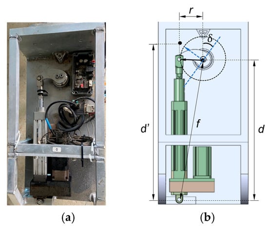 where denotes the length from the center point of the link slider to the endpoint of the piston rod and f represents the distance between the center point of the link slider and the base end of the electric actuator, while and signify the original length and the extended length from the front end to the base end of the electric actuator, respectively. In this study, = 8.07 cm, , and .