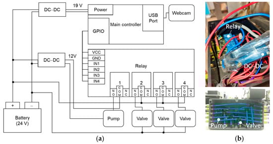 Spray module. (a) A diagram illustrating the spraying circuit. (b) The internal configuration of the control box showing peripheral components (top) and the arrangement of water pipe connections inside the spray box (bottom).
