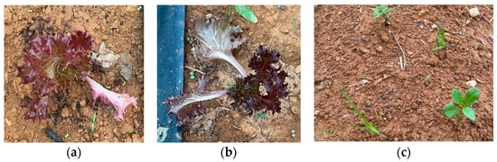 The experimental periods were divided into morning (9:00–11:00 a.m.), noon (12:00–2:00 p.m.), and afternoon (3:00–5:00 p.m.). The weather conditions during these periods varied and may have been sunny (9800~35,000 lux), partly sunny (3000~9800 lux), or cloudy (0~3000 lux). The experimental period spanned 3 months. Since lettuce crops are harvested approximately 20–30 days after sowing, a total of three harvests were performed during the trial, and the cultivated land was reseeded after each harvest. During the planting process, the amount of watering for each crop was adjusted, resulting in differences in growth conditions.