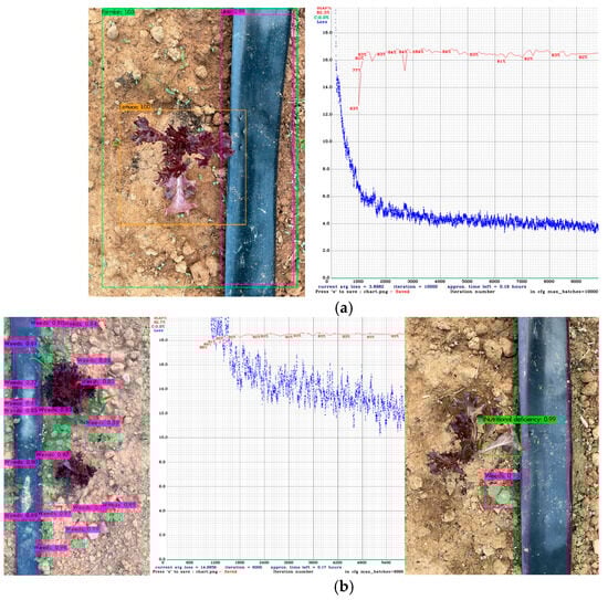 Identification of objects in the ridge using trained YOLO v4 models. (a) Detection results for the ridge, drip irrigation belt, and crops using DetModel #1. (b) Detection results for weeds and unhealthy crops using DetModel #2, featuring weed detection results (purple bounding box on the left side), the loss convergence curve (in the middle), unhealthy crops (green box on the right side), and weeds (purple bounding box).