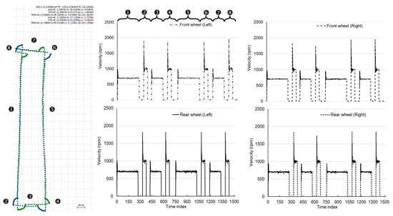 The velocity control of the farming robot in the farmland using PID control. (a) The movement trajectory of the robot (depicted by blue and green dotted lines) obtained using two GNSS receivers. (b) A comparison of the speed variation range and motion behavior of each wheel in relation to the positioning trajectory shown in (a). Numbers 1 through 8 correspond to the respective rotational speed changes of the four motors when the robot is in motion.