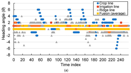 Secondly, the results of using different guidance lines for estimating the heading angle and correcting it through the FLC were compared, as shown in Figure 18a. The speed of the robot was 12.5 cm/s. The changes in the heading angles, measured from the regression lines generated by fitting different types of objects, were observed. It was found that when the crop line was used as the reference guidance line, it showed the largest change in heading angle (Figure 18a). Conversely, using the irrigation line as a guidance line resulted in minimal variation in the heading angle. Figure 18b shows the steering angle obtained by using the FLC when the crop line was the guidance line. The output value of the FLC ranged between ±2 degrees, with a few output values reaching ±6 degrees. These larger steering angle peaks appeared within the unit time range of 50~60, 120~130, or 225~235. These values reflect the heading angle and its changes during the corresponding time intervals when the robot traveled along the crop line (Figure 18a). The reason for these instantaneous changes in angles is that the planting position of the crops was deviated due to human factors, or crops that were not growing well (elongated) caused the center point of the labeled object to deviate too far from the expected position.