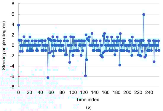 - Limited by the soil hardness and site flatness, in this study, the value of the PID controller was set to 0.5, enabling the four DC motors to reach the required speed quickly. Although there is a short-term small oscillation when the motor starts, its impact on the traveling speed of the robot is minimal. On the other hand, the FLC can smoothly adjust the heading angle and improve the two-wheel speed difference control method []. The experimental results show that when the robot moved in a guidance line at a speed of 12.5 cm/s, the variation in the heading angle stayed within one degree. Although no drip irrigation belt was present on the field, the average variation range of the heading angle remained within ±3.5 degrees (Figure 18a). Assuming that the planting position of the crops in the image was not on the vertical line in the center of the field ridge, it would also affect the estimated heading angle when the robot moved. For instance, in Figure 18a, at time indices of about 55, 130, 125, and 232, the heading angle estimated based on the crop line changed instantly by more than four degrees. Fortunately, this result has to be averaged with the heading angles obtained from the other regression lines, preventing ridge damage due to overcorrection of the wheels and avoiding misjudgment of the heading angle. When the robot rotated, a higher motor speed output value (1000 rpm) was used, ensuring greater torque was instantly available and allowing the four drives to power the motors. The advantage of the 4 WD/4 WS system is that it enables the robot to achieve a turning radius of zero. Compared with common car drive systems, this steering mode reduces the space required for turning and improves land use efficiency. Moreover, relying on RTK-GNSS receivers for centimeter-level autonomous guidance of a farming robot is a common practice []. This centimeter-level positioning error is acceptable when a fixed ambiguity solution is obtained []. However, there are risks in autonomous guiding operations on narrow farming areas. If the positioning signal is interrupted, or the positioning solution is a floating solution, then the robot may damage the field during movement.