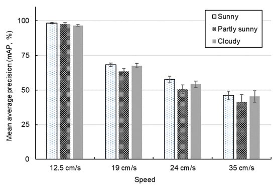 On the other hand, the impact of different speeds of the robot on the fitting results of the regression under varying weather conditions was observed. As shown in Figure 19, it is evident that the use of DetModel #1 enabled object detection and achieved a mean average precision (mAP) of 97% when the speed of the robot was 12.5 cm/s. However, as the speed of the robot increased, the mAP gradually decreased. Specifically, at a speed of 19 cm/s, the mAP dropped to below 75%, and when the speed of the robot reached 35 cm/s, the mAP decreased to below 50%. At a travel speed of 12.5 cm/s, there was no significant difference in the mAP under different weather conditions.