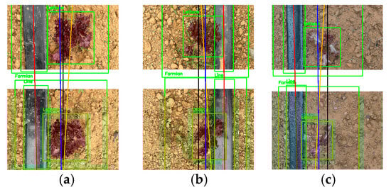 A snapshot of the results from using DetModel #1 to continuously detect objects of different categories (FPS = 7) and using the least squares method to generate guidance lines under different weather conditions is shown in Figure 20. Although Figure 20a,b displays an uneven brightness distribution, three lines were still generated: the irrigation line (red), the crop line (orange), and the field border line (blue). The same results were also observed in low-brightness environments, as demonstrated in Figure 20c.