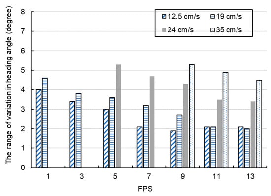 Variation range in heading angle versus FPS. The heading angle could not be obtained when the speed of the robot was 19 cm/s, 24 cm/s, or 35 cm/s.