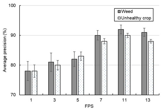 Comparison of the detection accuracy for weeds and unhealthy crops at different FPS values.