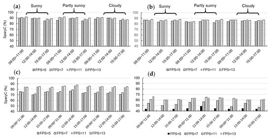Comparison of spray rates (SprayC) for the robot at different speeds and FPS values: (a) 12.5 cm/s; (b) 19 cm/s; (c) 24 cm/s; and (d) 35 cm/s.