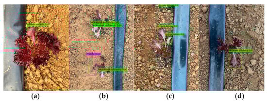 Red leaf lettuce (model: HV-067, Taiwan Known-You Seed Co., Ltd., Dashu Kaohsiung city, Taiwan) was selected as the target crop. Two YOLO v4 models were trained and employed for guidance line detection (DetModel #1) and the detection of weeds and unhealthy crops (DetModel #2). The users captured image samples randomly at the experimental site every day using cameras. These images encompassed weeds, both healthy and abnormal crops, drip irrigation belts, and ridges.