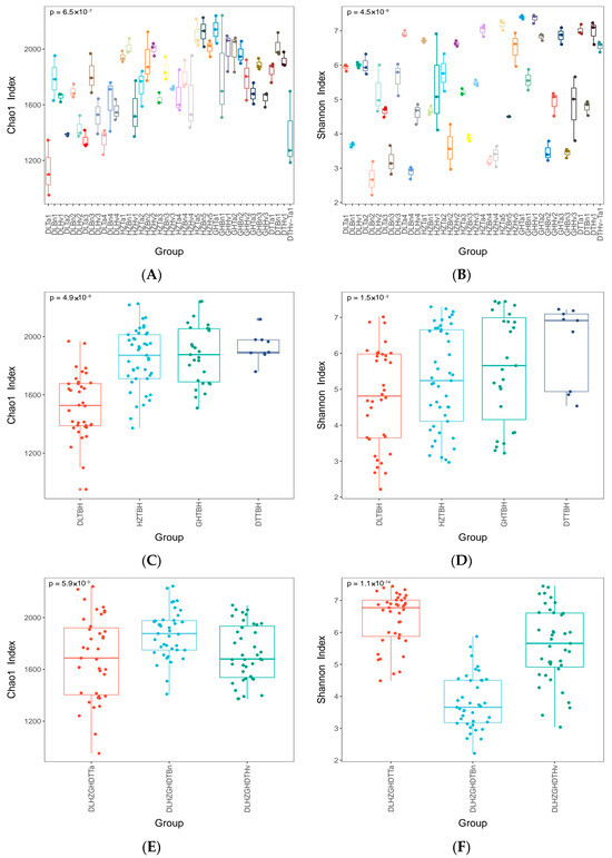 Fungal Chao1 and Shannon diversity indices of 40 different soils (A,B), four regions (C,D), and three crop types (E,F). The boxplots present medians and each sample. DLTa, DLBn, and DLHv respectively represent wheat, rapeeed, and barley soils in DL county. HZTa, HZBn, and HZHv respectively represent wheat, rapeeed, and barley soils in HZ county. GHTa, GHBn, and GHHv respectively represent wheat, rapeeed, and barley soils in GH county. DTTa, DLBn, DTHv, and DTTa-Hv respectively represent wheat, rapeeed, barley, and wheat/barley soils in DT county. 1, 2, 3, 4 or 5 represent the number of sample. DLTBH: DL region soils; HZTBH: HZ region soils; GHTBH: GH region soils; DTTBH: DT region soils; DLHZGHDTTa: wheat soils; DLHZGHDTBn: rapeseed soils; and DLHZGHDTHv: barley soils.