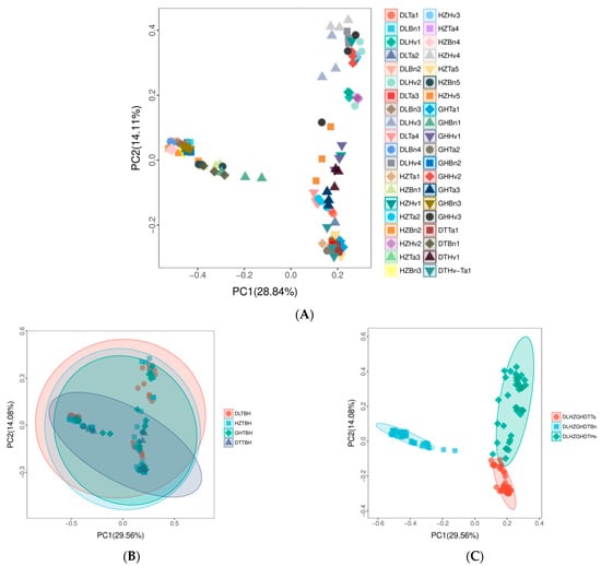 A PCoA based on Bray–Curtis dissimilarity revealed differences in the fungal communities extracted from the soil samples (Figure 2A). It indicated that the four regions greatly overlapped (Figure 2B) and that the wheat and barley soils slightly overlapped; however, rapeseed soil clearly separated from wheat and barley soils (Figure 2C).