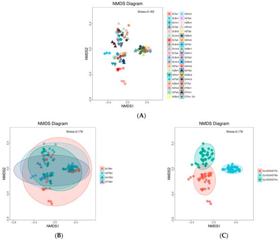 NMDS was conducted to illustrate the variance of the fungal communities in the samples (Figure 3). When stress was less than 0.2, NMDS accurately reflected the differentiation of 40 soil samples (Figure 3A). Regional comparisons revealed distinct fungal communities in the HZ, DL, GH, and DT regions (Figure 3B, ANOSIM; R = 0.189, p = 0.001). NMDS ordination plotting showed an extremely significant separation within all three crop groups (Figure 3C; R = 0.878, p = 0.001).