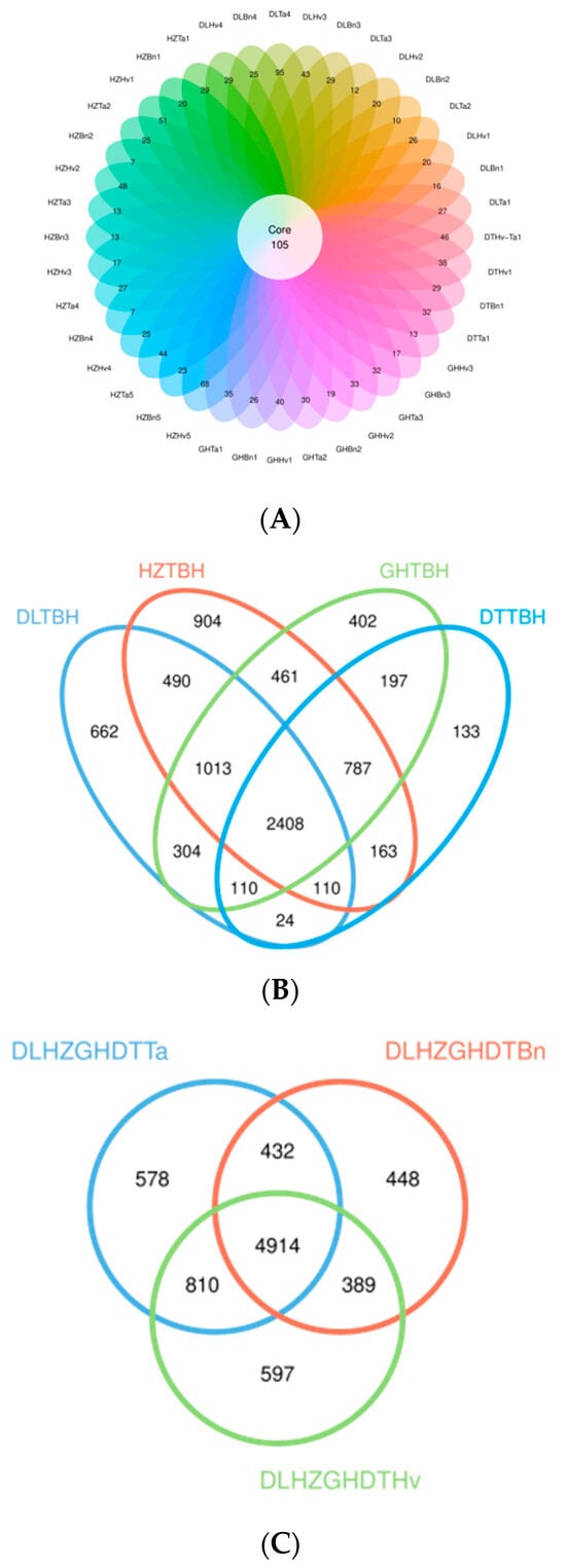 Venn diagram showing shared and unique fungal OTUs. (A) Among 40 different soils. (B) Among four regions. DLTBH, HZTBH, GHTBH, and DTTBH represent the DL, HZ, GH, and DT soils, respectively. (C) Among three crop soils. DLHZZGHDTTa, DLHZZGHDTBn, and DLHZZGHDTHv represent wheat soil, rapeseed soil, and barley soil, respectively.