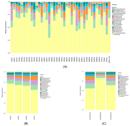 The raw sequences were further demultiplexed and filtered for quality using the Quantitative Insights into Microbial Ecology software (QIIME, version 1.9.1). FASTQ files were used for subsequent alignment. The joined sequences were subjected to quality screening, and low-quality sequencing reads with quality scores less than 20 and lengths shorter than 200 bp were filtered out. Next, the sequencing dataset was used for taxonomic assignment, and unique sequences were aligned to the UNITE ITS database (https://unite.ut.ee/, accessed on 27 September 2023) at a 70% identity threshold. Operational taxonomic units (OTUs) were clustered at 97% nucleotide sequence similarity by Vsearch (version 1.9.6). The Bayes algorithm classifier, provided by the Ribosomal Database Program (version 2.2), was used to analyze the representative OTU sequences. The community composition of each sample was analyzed at different taxonomic levels.