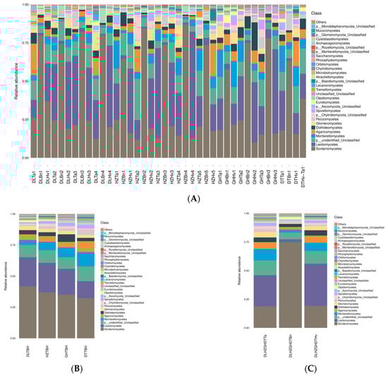 Relative abundances of fungal classes in 40 soil samples (A), four regions (B), and three crops (C). The abscissa is the name of the soil sample. The ordinate is the relative abundance of different class. In the legend, each colored box corresponds to a class name on the right. “Others” refers to taxa other than the 30 classes with the highest relative abundances.