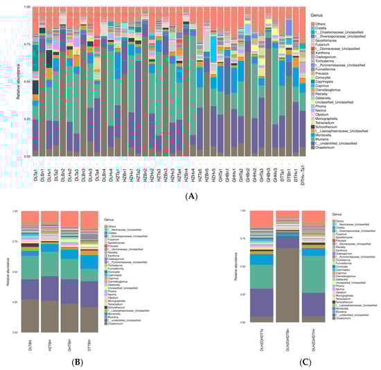 A total of 663 fungal genera were found. Chaetomium was the top genus in all rapeseed soils and had relative abundances that ranged from 41.32% (GHBn1) to 81.34% (HZBn4) (Figure 8A). Blumeria (22.45–66.32%) and unclassified genus (20.85–61.66%) were the dominant genera in 15 and 11 soil fungal communities, respectively. The most prevalent genera in the DL, HZ, and GH regions were Chaetomium (23.82–27.34%), unclassified genus (16.44–20.00%), and Blumeria (16.84–20.23%) (Figure 8B). In DT soil, the predominant genera were unclassified fungi (21.45%), Chaetomium (20.78%), Mortierella (11.23%), and Blumeria (10.16%). Crop type influenced the structure of the fungal communities at the genus (Figure 8C). Chaetomium and unclassified genus dominated in rapeseed soil, with relative abundances of 66.42% and 10.98%, respectively. By contrast, in wheat and barley soils, the dominant fungi were Blumeria and unclassified genus, with relative abundances of 21.31–33.19% and 20.99–25.04%, respectively.
