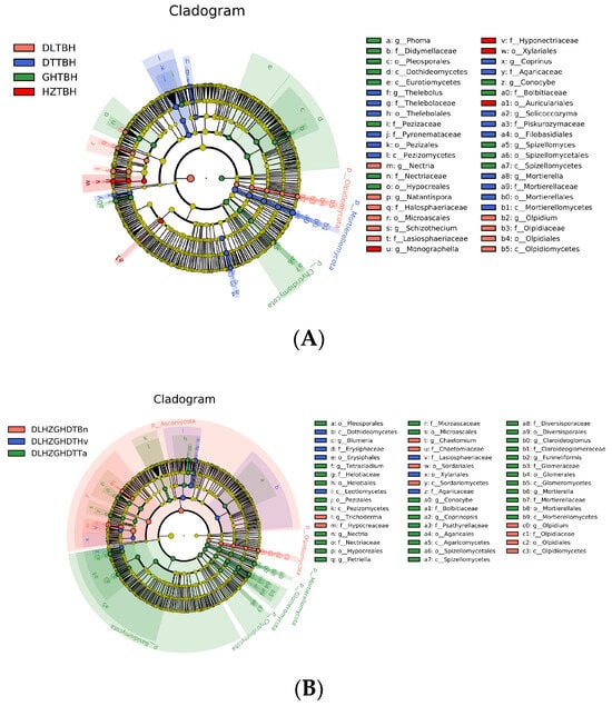 Cladogram presenting the phylogenetic distribution of fungal taxa in four regions (A) and three crop types (B) based on LEfSe analysis. DLTBH: DL region soils; HZTBH: HZ region soils; GHTBH: GH region soils; DTTBH: DT region soils; DLHZGHDTTa: wheat soils; DLHZGHDTBn: rapeseed soils; DLHZGHDTHv: barley soils.