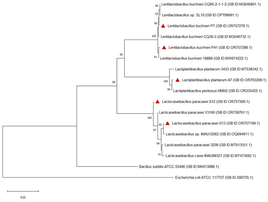 Phylogenetic tree based on 16S rRNA gene sequences showing the position of selected LAB isolates (marked with a filled red triangle pointing upwards). Bacillus subtilis ATCC 55406 and E. coli ATCC 11775T were taken as an out-group. Bootstrap values are given at branching points.