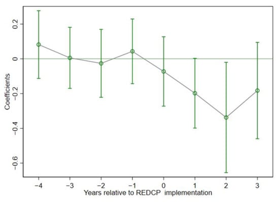 The pivotal premise in deriving the DID regression results is that the ACE trend before REDCP implementation is consistent between REDCP and non-REDCP cities. Following Beck et al. [], we use the fifth year prior to REDCP implementation as the reference period and omit this period to avoid the multicollinearity bias. The common trend test findings are displayed in Figure 3. We find that the REDCP coefficients are insignificant within the 95% confidence interval from zero for all years prior to the implementation of REDCP, suggesting a common trend and passing the pre-existing trend test for this study design. Therefore, we can use the DID model to explore how REDCP affects ACEs.