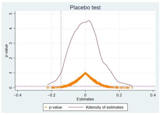 To rule out the presence of any further unobservable influences, we run a placebo experiment based on Cai et al. []. By choosing the year and city where the REDCP is applied at random, we specifically create a “false REDCP” variable. The regression based on Model (1) is then repeated with the “false REDCP” variable. The process is replicated 500 times. If the “false REDCP” significantly affects ACEs, it is possible that other unobservable factors are influencing the benchmark results. Conversely, if the “false REDCP” has no significant effect on ACEs, it can be inferred that the estimation results are robust and that it is the REDCP that causes the effect, not other unobservable differences.