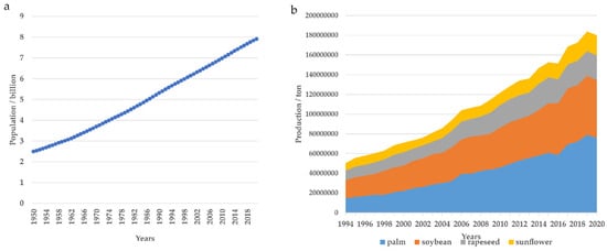The growth of the global population and the expansion of palm, soybean, rapeseed, and sunflower production. (a). The global population has experienced a rapid growth from 1950 to 2021. Data from the FAO (https://www.fao.org/faostat/zh/#data/OA/visualize, accessed on 10 December 2023). (b). The global production of palms, soybeans, rapeseed, and sunflowers exhibited a consistent upward trajectory from 1994 to 2021. Data from the FAO (https://www.fao.org/faostat/zh/#data/QCL/visualize, accessed on 10 December 2023).