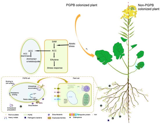 Extracellular precipitation refers to the process in which certain extracellular substances are produced by PGPB to chelate, complex, and precipitate heavy metal ions. This effectively reduces the movement of heavy metal ions and their absorption by plant roots. Cellular adsorption involves the cell wall structure and substances on the cell surface adsorbing heavy metal ions, thereby reducing the possibility of these ions being absorbed by the roots. Intracellular accumulation, on the other hand, is the transformation and precipitation of heavy metal ions in cells. These three mechanisms play a crucial role in promoting plant growth under conditions of heavy metal stress. However, cellular adsorption is particularly favored for its extensive surface area and strong adsorption capacity exhibited by bacteria. Therefore, cellular adsorption is a metabolism-independent mechanism that can occur both in living cells and dead microbial biomass [].