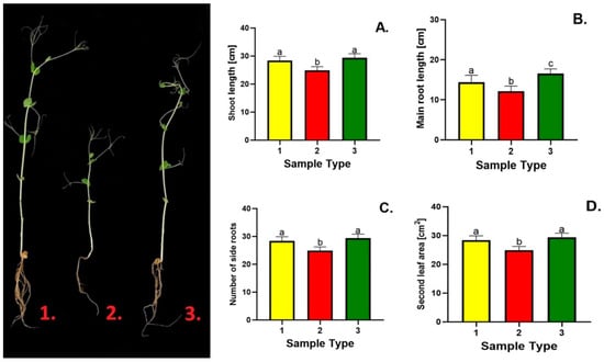 General appearance of peas: 1—pea grown on soil regularly fertilized with manure, 2—pea grown on soil taken from the vicinity of a manure heap, 3—pea grown on horticultural perlite-controland morphological parameters (A) shoot length [cm], (B) length of the main root [cm], (C) number of side roots, (D) area of the second leaf [cm2]. 1 (yellow column)—pea grown on soil regularly fertilized with manure, 2 (red column)—pea grown on soil taken from the vicinity of a manure heap, 3 (green column)—pea grown on horticultural perlite—control. Means marked with different letters differ significantly (p ≤ 0.05) between groups (ANOVA, Tukey HSD test).
