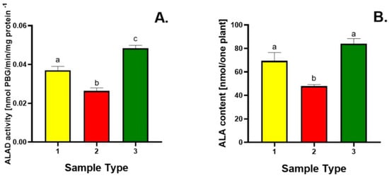 ALAD activity [nmol PGB/min/mg protein] (A) and ALA content [nmol × one plant−1] (B) in peas grown on soil regularly fertilized with manure—1 (yellow column); collected from the vicinity of manure heaps—2 (red column) and the horticultural perlite—3 (green column). Means marked with different letters differ significantly (p ≤ 0.05) between groups (ANOVA, Tukey HSD test).