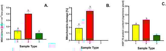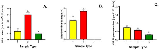 Biochemical parameters (A) concentration of MDA [nmol × mL−1 × one plant−1], (B) damage to mitochondria [%], (C) concentration of HSP70 proteins [ng × mL × one plant−1]) of pea growing on soil regularly fertilized with manure—1 (yellow column), collected from the vicinity of manure heaps—2 (red column) and on horticultural perlite—3 (green column; plants grown in perlite did not exhibit any symptoms of mitochondrial damage). Means marked with different letters differ significantly (p ≤ 0.05) between groups (ANOVA, Tukey HSD test).