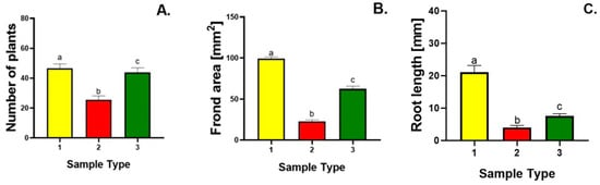 Morphological parameters (A) number of plants, (B) area of fronds [mm2], (C) root length [mm]; 1 (yellow column)—duckweed cultivated on the filtrate of soil regularly fertilized with manure, 2 (red column)—duckweed grown on filtrate of soil taken from the vicinity of the manure heap, 3 (green column)—duckweed grown on MS medium. Means marked with different letters differ significantly (p ≤ 0.05) between groups (ANOVA, Tukey HSD test).