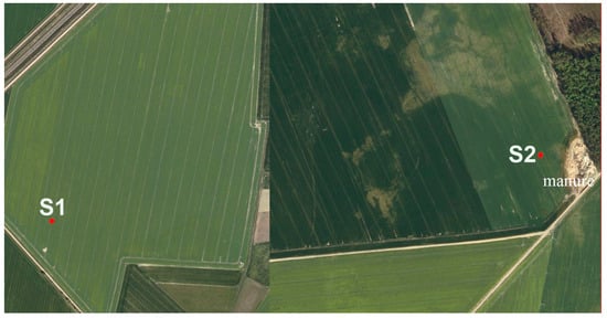 Pollutants emitted by poultry farms end up in water, air, and soil. They can infiltrate soils from the air, but improper manure storage or application is more often the source of contamination. During animal production, tons of animal waste are generated in each breeding cycle [20]. Manure management strategies in the European Union assume its use in the surrounding agricultural fields as an organic fertilizer [22], but the amount of manure produced usually exceeds the amount needed to fertilize the surrounding fields, which means that it needs to be stored [13]. To minimize the risk of contaminants from manure getting into the soil or waters, it should be processed and stored in special buildings, closed or open lagoons, or places with impermeable pads [40]. The spreading of contaminated manure to the fields causes the penetration of micropollutants into the soil, thus affecting changes in the properties and deterioration of soil quality. Leachate and runoff from improperly stored animal manure also pose a threat to the surrounding fields. Soil contamination is one of the greatest threats to sustainable agriculture [41]; therefore, the soil quality in areas affected by intensive poultry farms should be constantly monitored. Two soils collected from farmlands located near chicken farms were analyzed and characterized (Table 1). Soil S1 is regularly fertilized with manure, while soil 2 (S2) is taken from the field closest to the manure heap (at a distance of approx. 3 m; see map 1 (Scheme 1)).