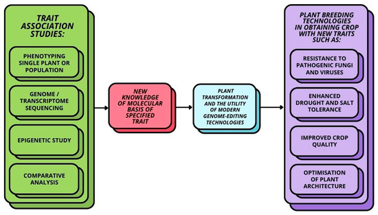 Growing human populations combined with the challenges posed by climate change highlight the need for resilient and high-yielding crops. Genome-editing technologies such as CRISPR/Cas9 systems have the potential to contribute to groundbreaking advances in plant breeding. However, in order to use these techniques effectively, an in-depth knowledge of plant genomics, physiology and ecology is essential [1,2]. Through genome sequencing and functional analyses, researchers have gained insights into the genes and proteins that play pivotal roles in key aspects of crop development, offering a multitude of possibilities for enhancing the traits of selected plants [3]. Trait association studies provide a wide range of knowledge that can be used to plan new traits in crop development, including basic information on phenotypic traits, genomic and transcriptomic data, and knowledge from epigenetic studies through comparative analysis across a wide range of plants (Figure 1).