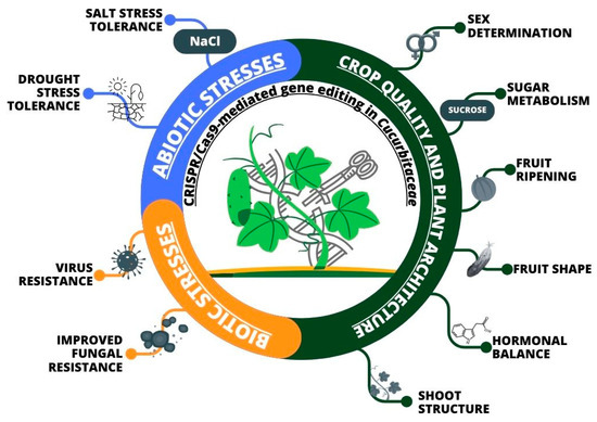 Using this specific information, researchers and breeders have acquired efficient and powerful tools for precise manipulation of genetic material through precise genome-editing techniques. CRISPR/Cas9-based genome-editing techniques have triggered a revolution in genetic modification, allowing the targeted modification of specific genes [7]. Genome editing offers unprecedented opportunities to apply an understanding of genomics to improve crop traits in many plant species, including in Cucurbits.