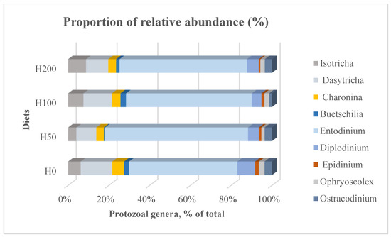The relative abundance of observed protozoal genera in the rumen of cows fed with four experimental diets (H0, H50, H100, H200).