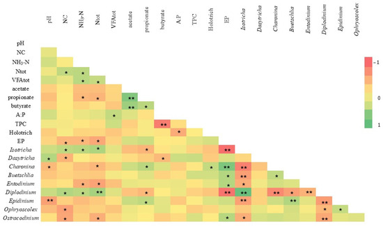 Heatmap based on Pearson correlation coefficients between the relative abundances of rumen protozoa genera and rumen fermentation parameters. Asterisks (* and **) indicate a significant correlation at p < 0.05 and 0.01. Red and green tiles indicate positive and negative correlations, respectively.