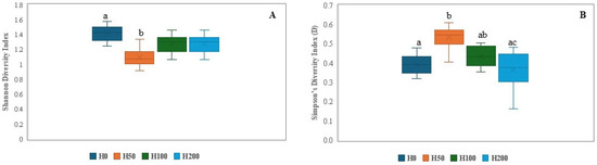 Analysis of alpha diversity: richness (A) at the genus level (using the Shannon–Weiner index) and Simpson’s diversity index (B). Median values and interquartile ranges are indicated in the plots. Different superscript letters indicate the significant differences between the treatment groups (p < 0.05).