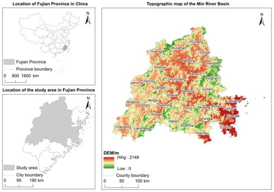 The Min River basin is located between 116°23′ E to 119°43′ E and 25°23′ N to 28°19′ N in the subtropical zone, characterized by a mild climate and abundant rainfall. The main river of the Min River is 541 km long, with a total river length of 2872 km and a drainage area of 60,900 km2. Of this area, 59,000 km2 is within Fujian Province, making up 98.2% of the basin’s drainage area and nearly half of the province’s total area of 122,000 km² (Figure 1). The basin is approximately 300 km wide from east to west and 300 km long from north to south, encompassing all of Sanming City and Nanping City, as well as parts of Ningde, Fuzhou, Quanzhou, Putian, Longyan, and other cities (see Table 1 for details). By the end of 2020, the basin’s per capita cultivated land area was 0.0764 hectares, which is 1.78 times higher than the per capita cultivated land area of 0.0275 hectares in Fujian Province. In 2020, the total grain output of the basin was 3,596,930 tons, accounting for 71.61% of the province’s total output, underscoring its importance as a key base for commercial grain production in the province.