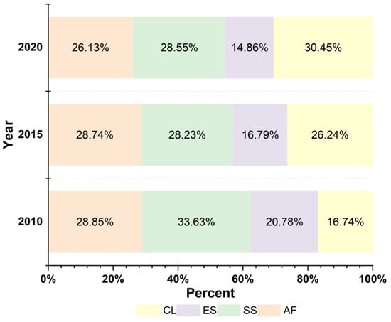 According to the analysis of the proportion of each cultivated land function in the comprehensive functional species, as shown in Figure 2, the multifunctional structure of cultivated land in the Min River basin has significantly changed from 2010 to 2020. The cultural landscape function has consistently grown over this decade, with its proportion increasing markedly from 16.74% in 2010 to 30.45% in 2020. This growth reflects society’s increasing recognition of the value of agricultural cultural heritage and natural landscapes, as well as a greater emphasis on the versatility of agriculture. Meanwhile, the proportion of agricultural production and ecological service functions has declined annually. The share of agricultural production functions decreased from 28.85% in 2010 to 26.13% in 2020, while the proportion of ecological service functions dropped from 20.78% in 2010 to 14.86% in 2020. These declines may be related to the reduction in cultivated land due to urbanization, the adjustment of agricultural structures, and the growing demand for ecological protection. The trend in the proportion of the social security function is more complex, showing a fluctuation of first decreasing and then rising, although the overall trend remains downward. In 2015, the proportion of social security functions reached its lowest point at 28.23%, while in 2010, it peaked at 33.63%. This change may be associated with socio-economic development, demographic shifts, and adjustments in social security policies. Among all functions, the social security and cultural landscape functions hold the largest proportions in comprehensive functions, suggesting that policymakers and land managers should prioritize these leading functions in regional development and thoroughly consider them in land use planning.