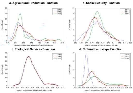Based on the evaluation results of various functional levels of cultivated land, the kernel density curves of agricultural production, social security, ecological services, and cultural landscape functional levels of cultivated land in 2010, 2015, and 2020 were drawn (Figure 3). From the agricultural production function KDE curve, the center of gravity of the curve shifted first to the right and then to the left; the curve turned from a single peak to a multi-peak. The principal peak value increased, indicating that the agricultural production function level of cultivated land in the Min River basin increased first and then decreased during the study period. The agricultural production function of counties and cities showed a trend of multi-polarization, but the overall difference narrowed. From the social security functional kernel density curve, the center of gravity of the curve shifted first to the left and then to the right, constantly in a uni-peak state. The peak value continued to rise, indicating that the social security function level of cultivated land in the Min River basin declined and then increased. The gap between counties and cities narrowed during the study period. From the kernel density curve, the center of gravity of the curve did not shift significantly and remained a single peak. The peak height changed little, indicating that the level of cultivated land ecological service function in the Min River basin was stable during the study period. The ecological service function in the Min River basin converged to a unified equilibrium point. From the cultural landscape functional kernel density curve, the center of gravity of the curve gradually shifted to the right, the curve turned from an unimodal peak to a bimodal peak, and the height gradually decreased, indicating that the function level of the cultivated land cultural landscape in the Min River basin showed an overall upward trend during the study period. The cultural landscape functions of counties and cities gradually became multipolar, and the differences expanded.