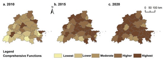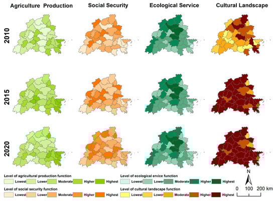 Figure 3. Temporal evolution characteristics of various functions of cultivated land in the Min River basin in 2010, 2015, and 2020.