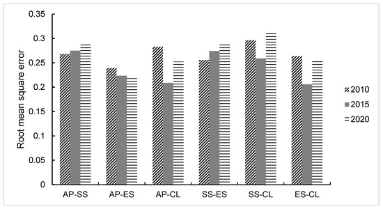 The concept of benefit equilibrium, as proposed by Bradfon [51], introduces the root mean square error (RMSE) as a measure to quantify the disparity between the value of a single function indicator and the average value of a multifunction indicator. This measure also represents the uneven rate of change in the multifunctionality of territorial space in the same direction. It intuitively expresses the spatial differences in the intensity of trade-offs between agricultural production, social security, ecological services, and cultural landscape functions. The RMSE value ranges from 0 to 1. A higher value indicates a stronger tradeoff intensity, whereas a lower value indicates a weaker trade-off intensity. RMSE is computed using the following formula: