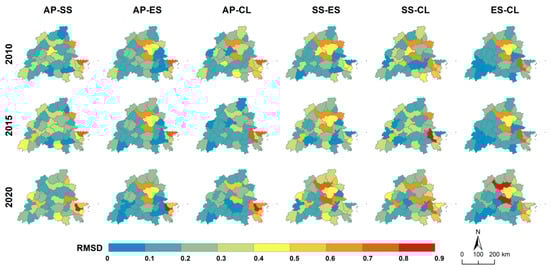 Based on the RMSE model, the intensity of trade-offs between the multifunctionality of cultivated land in the Minjiang River basin for the years 2010, 2015, and 2020 was determined. From Figure 6, it is evident that the trade-off intensity related to social security functions has generally increased across all pairwise relationships, while the trade-off intensity for other cultivated land functions has shown a weakening trend. Notably, the trade-off intensity between agricultural production and cultural landscape has experienced the most significant decrease. Figure 7 illustrates the spatial distribution differences in trade-off intensity between the multifunctionality of cultivated land across the counties and cities in the Min River basin.