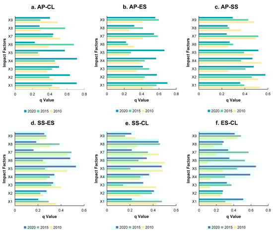 Different influencing factors affected the spatial differentiation of multifunctional trade-off intensity of cultivated land in different years (Figure 8). From the perspective of influencing factors, the spatial differentiation of agricultural production-social security, agricultural production-ecological services, agricultural production-cultural landscape, and ecological services-cultural landscape trade-off during the study period were most affected by natural factors, and the average q values were 0.4299, 0.4494, 0.3963, and 0.3769, respectively. The spatial differentiation of social security-cultural landscape and ecological services-cultural landscape trade-off was most affected by human factors, with average q values of 0.3392 and 0.3345, respectively.