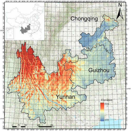 Location of the study area—Chongqing, Guizhou, and Yunnan in China—and its elevation range.
