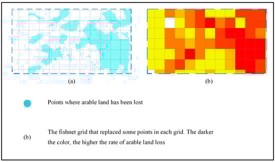 The steps to implement GWR analysis with the grid method. (a) Create the fishnet, and (b) use the fishnet to demonstrate the arable land loss rate. The color of different degree represents the loss rate of arable land. The darker the color, the higher the rate of arable land loss.