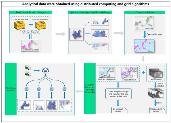 As shown in Figure 3, the main operational steps comprised the following seven steps to obtain the data required by the GWR model to study multiple drivers of arable land loss in the Yunnan, Chongqing, and Guizhou regions. (1) Obtain the arable land loss raster in the period using the raster images of two time points for subtraction. (2) Segment and extract the provinces into sub-regions. (3) Create a fishnet with 300 m × 300 m grid cells to cover the studied sub-regions and generate the corresponding point data and fishnet data. (4) Calculate the arable land loss rate within each grid cell and select the grid cell with arable land loss. (5) Use the filtered fishnet to perform partition statistics on the independent variable raster and calculate the mean value of the independent variable within each grid cell. (6) Extract independent and dependent variables from each raster cell, add latitude and longitude coordinates, and preprocess the independent variable to obtain the final data table required for the model. (7) Complete data analysis on the GPU cloud server to execute geographically weighted regression for each point.